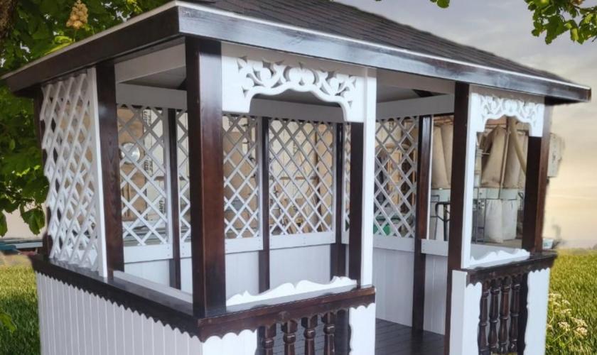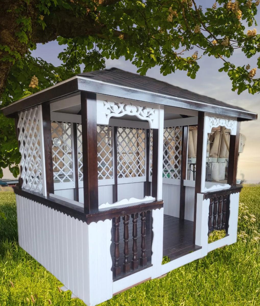 В стоимость входит Кровля: гибкая черепица (цвет - на выбор), несъемные лавочки в цвет беседки, прямоугольный стол, фундаментные блоки.