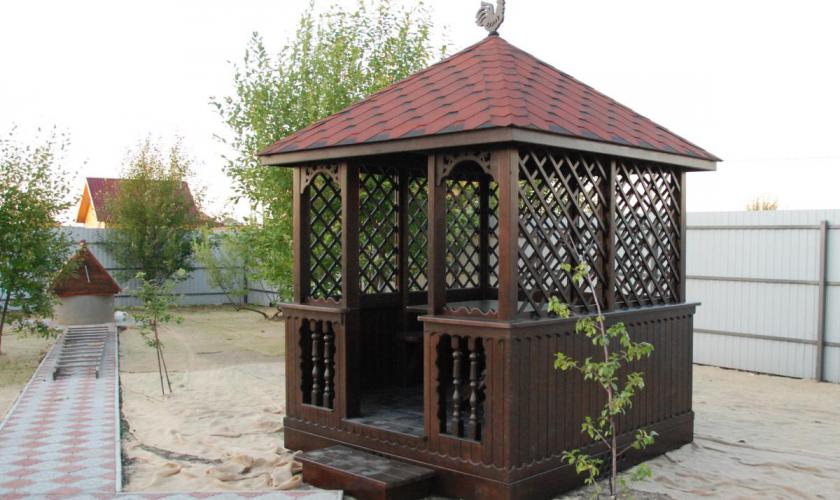 | В стоимость входит | Кровля: гибкая черепица (цвет - на выбор), несъемные лавочки в цвет беседки, прямоугольный стол, фундаментные блоки. |