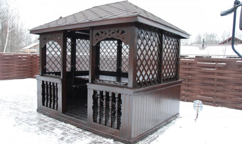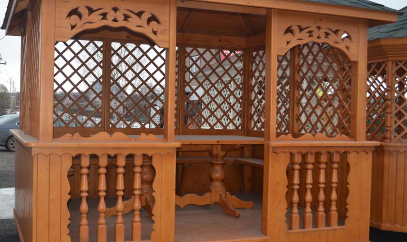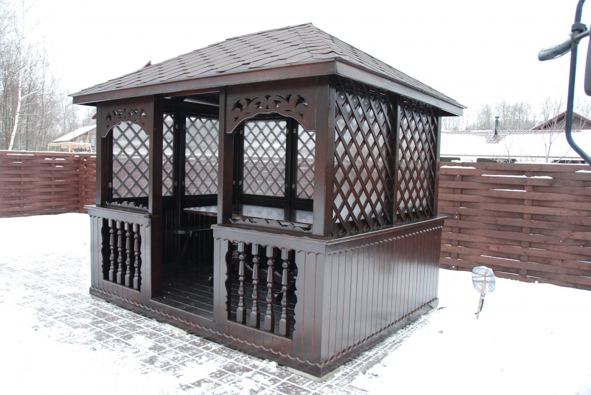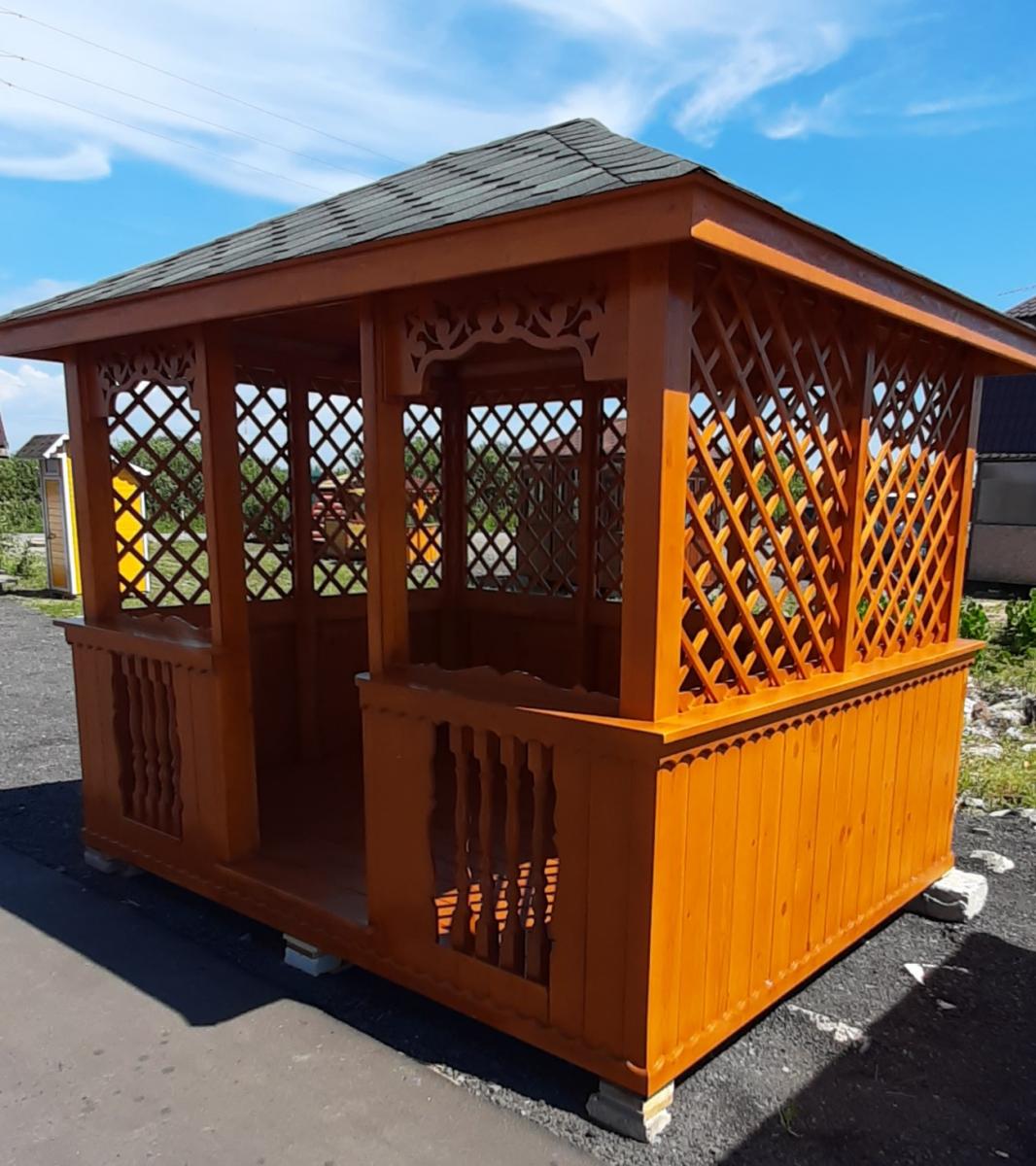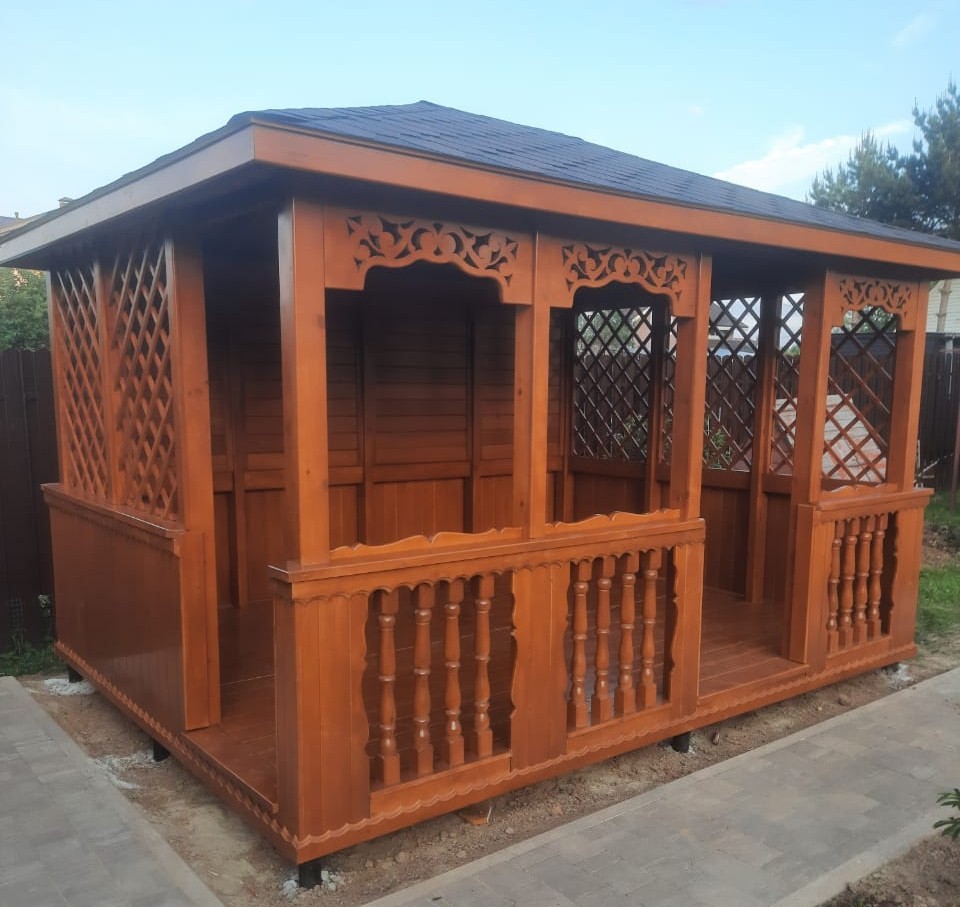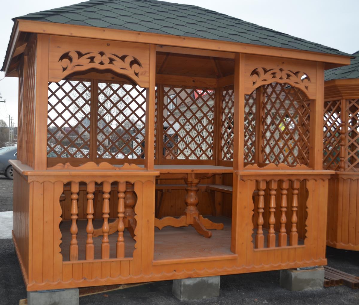 | В стоимость входит | Кровля: гибкая черепица (цвет - на выбор), несъемные лавочки в цвет беседки, прямоугольный стол, фундаментные блоки. |